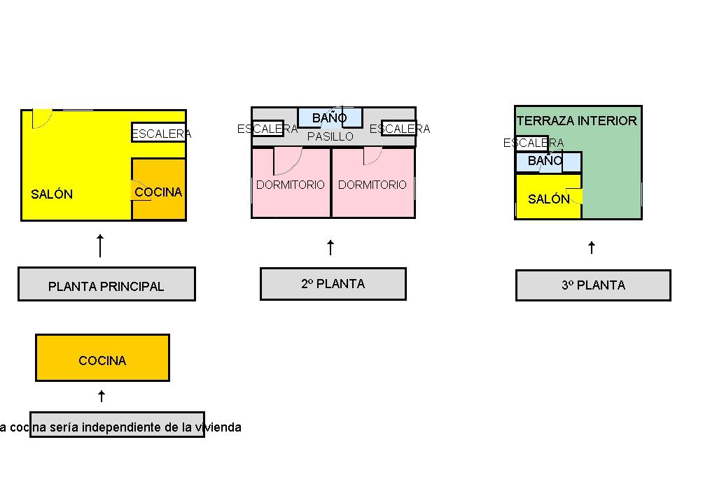 PRIMERA PLANTA; Salón con pequeña cocina. PLANTA SUPERIOR; Dos dormitorios amplios y luminosos, baño completo con bañera y ventana. PLANTA TERCERA; Salón - comedor con balcón y chimenea, cocina independiente. Además de tener acceso a una GRAN TERRAZA. Es una vivienda que se puede ir actualizando y poder vivir mientras en ella.